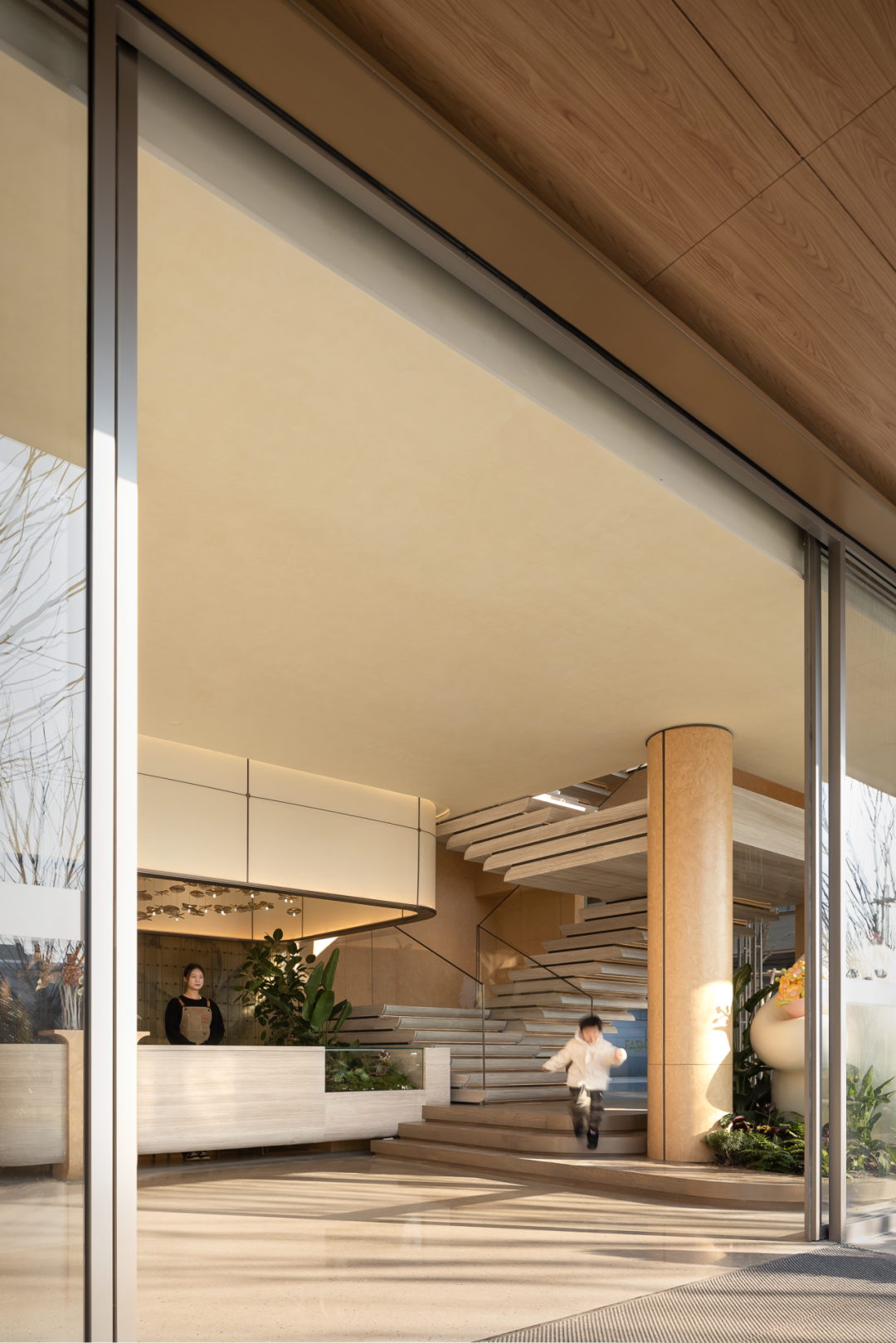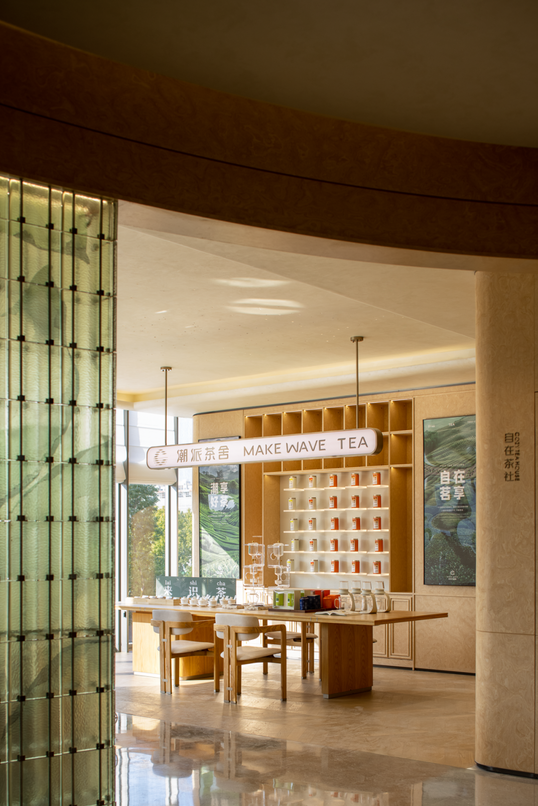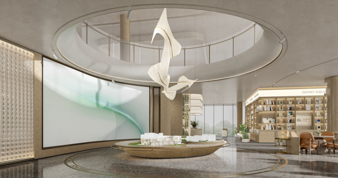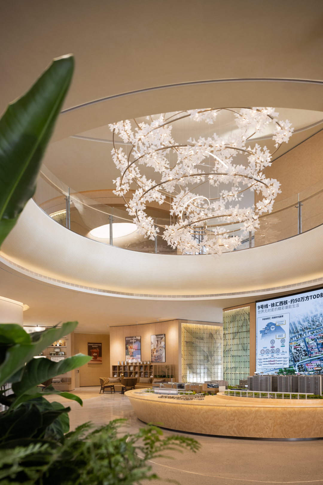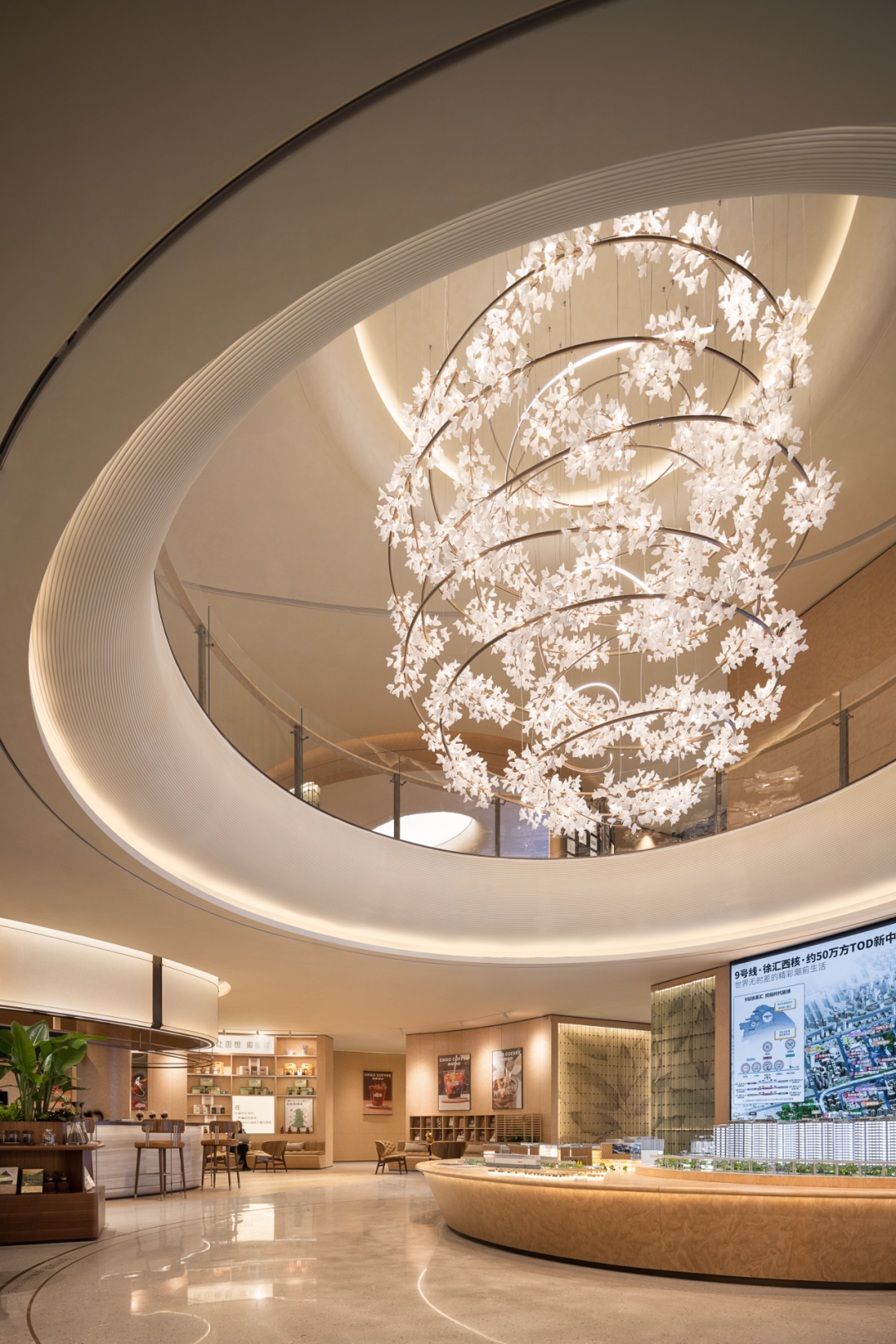 / Space renderings display ( 空间效果图展示 ) / Entrance Space ( 前厅接待 ) 设计超越了形式上的奢华,以宁静中蕴藏张力、克制中饱含温情,以现代的建筑语言和隽永的设计思考勾勒出关于生活愿景的美好构想。 入口扶梯盘如螺旋状的时间之塔,象征着不断向上的力量与进取之心。自然在这里不是被描绘,而是被感知和体验;建筑不是冷硬的容器,而是情感与记忆的温暖载体。 Model structure / 接待前厅 / Commercial Sand Table ( 商业沙盘 ) Second floor / 二层 沙盘区域以流动的曲线为核心,空间设计中关于时间与空间交互的象征,以艺术的方式连接地面与苍穹,托起人们对生活的美好愿景。 钢架结构的简洁力度与绿色水晶玻璃的灵动质感彼此交融,为整个空间注入蓬勃的生命力。 既如城市脉络的交织,又似春风拂过湖面的涟漪。它们在空间中交融,如星河下的波光粼粼,将流动的动态美学定格于一场绚烂的光影盛宴。 / Center Sand Table ( 中心沙盘 ) First floor / 一层 设计用流线、光影与材质书写出关于未来的诗篇,将奢华隐于质朴,将艺术寄于人文,让每一位踏入者都能感受到一种心灵的自由与愉悦。 中心沙盘不仅是空间导引的核心,整个商业空间通过不同区域的精心设计,将未来主义、现代简约、自然元素和人文关怀完美结合。 Flower Art Study / 花艺书坊 沙盘屏风的体块嵌入设计,通过几何块面的层叠组合与材质切换,屏风在视觉上打破了沙盘区域的单一性,使空间结构更具动态张力与视觉层次。 / Coffee & Negotiation ( 咖啡 & 洽谈 ) Coffee Bar / 咖啡水吧 设计在克制中展现张力,以最精炼的线条勾勒最饱满的情感关怀。透过设计语言的深度融合,为消费者营造沉浸式体验场景,见证着人与空间的互动。 Model structure / 咖啡水吧 商业区在此不再是被动的场所,而是充满艺术性和互动感的动态剧场,感知生活美学、交流情感的文化场域。 空间中的木与光、透明与反射相互交织,形成了不规则的形态感与视觉层次。 材质与结构在这里共同讲述着自然与人文的建筑叙事,仿佛延续着街头弄堂的旧日情怀。 VIP reception area / VIP会客区 VIP会客区以半开放式布局巧妙平衡了私密性与空间的流动感,打造出独具品位的尊贵氛围。 / Tea & Discussion salon ( 潮享茶舍 & 悦谈沙龙 ) Second floor / 二层 设计师以微妙的空间界限引导人们的视线流动,使场域的边界隐约而生动。 自然光透过柔玻璃幕墙倾泻而下,与室内精心布置的灯光相辅相成,营造出动静交织、光影错落的诗意氛围。 清晨阳光温暖而柔和,随着时间推移,光影逐渐转变为金色的绚烂辉光,映衬出空间的层次感与深度。 品牌引入 / 户外潮店 / Fashion Market ( 潮享市集 ) Third floor / 三层 室内活动区:文创市集的灵动人文与自然交融。天花板的模块化木质构件以有序的韵律排列,空间呈现虚实交替、光影渗透的动感体验。 原木材质的天然纹理与玻璃幕墙交相辉映,映射出流动的自然光影,模糊了内外界限,让空间如若隐若现,延展至窗外的绿意和城市的脉动。 Dessert Table / 甜品台 活动区不仅是交流与互动的空间,更是一场人文与自然主题的艺术剧场。环形展台兼具工艺感与艺术性,它们承载着人们对自然与文化的思索。 Ring booth / 环形展台 项目信息 Information ━ 项目名称丨上海泗泾TOD项目 · 时代潮派售楼处 项目业主丨招商蛇口上海公司 甲方团队丨招商蛇口产品管理中心、上海设计管理部 项目地址丨上海 · 松江泗泾 项目面积丨1300㎡ 空间设计丨纳沃设计 陈设设计丨集艾设计 摄影团队丨瀚墨视觉