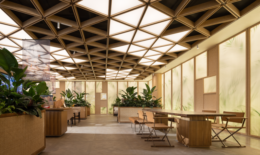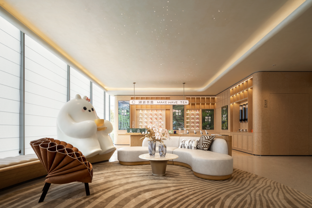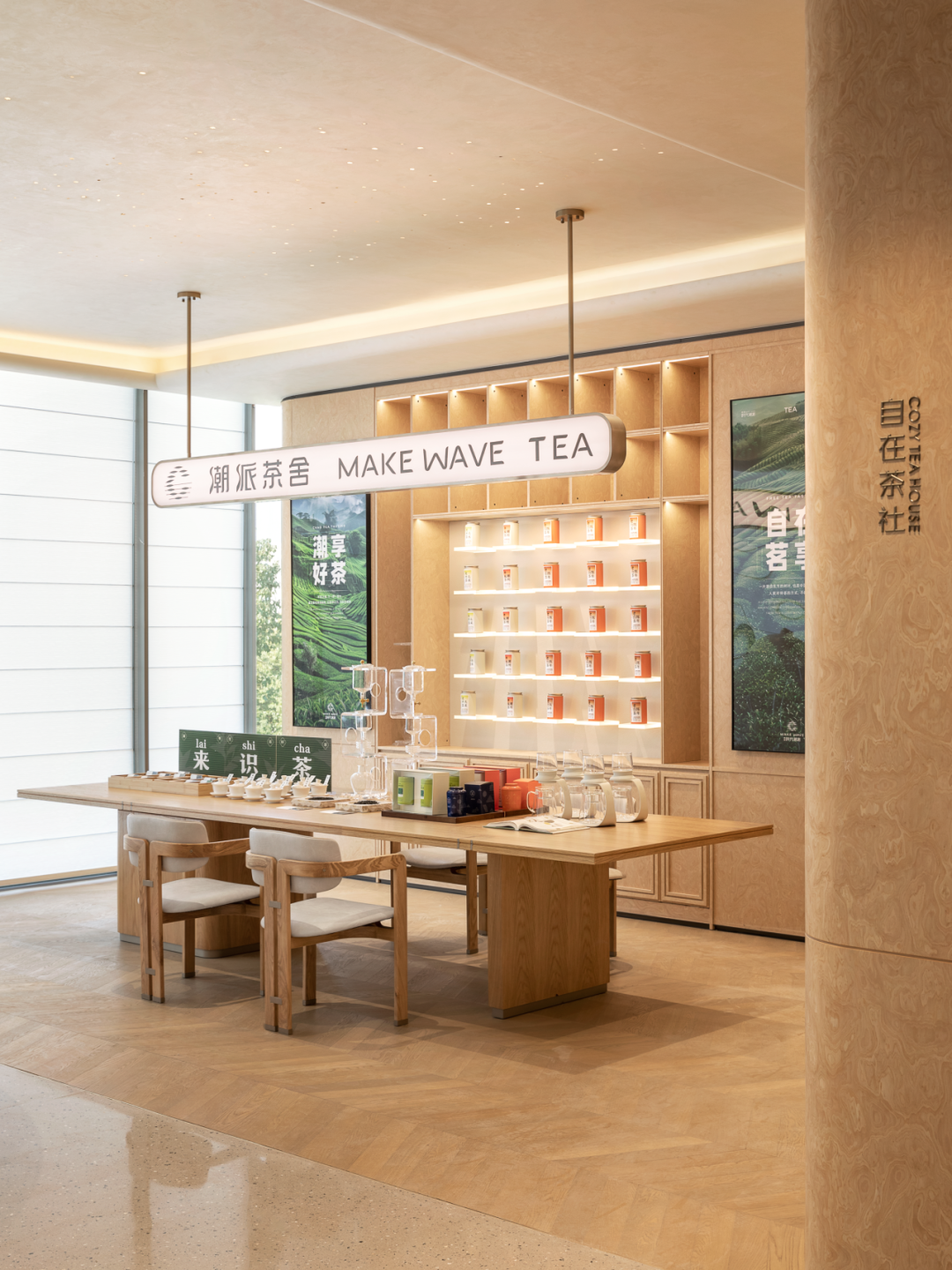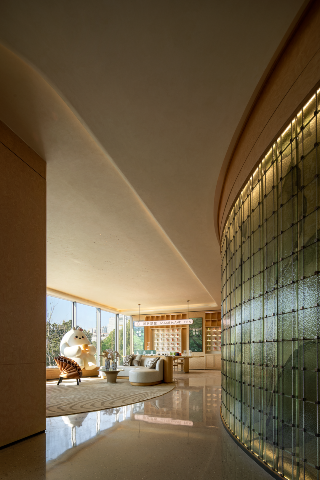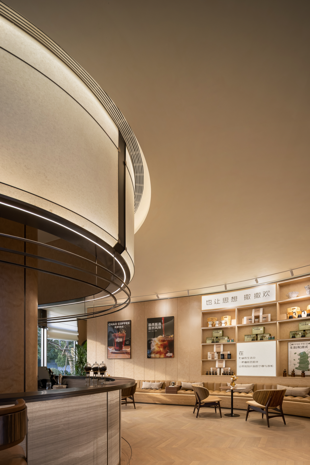/ Space renderings display ( 空间效果图展示 ) / Entrance Space ( 前厅接待 ) 设计超越了形式上的奢华,以宁静中蕴藏张力、克制中饱含温情,以现代的建筑语言和隽永的设计思考勾勒出关于生活愿景的美好构想。 入口扶梯盘如螺旋状的时间之塔,象征着不断向上的力量与进取之心。自然在这里不是被描绘,而是被感知和体验;建筑不是冷硬的容器,而是情感与记忆的温暖载体。 Model structure / 接待前厅 / Commercial Sand Table ( 商业沙盘 ) Second floor / 二层 沙盘区域以流动的曲线为核心,空间设计中关于时间与空间交互的象征,以艺术的方式连接地面与苍穹,托起人们对生活的美好愿景。 钢架结构的简洁力度与绿色水晶玻璃的灵动质感彼此交融,为整个空间注入蓬勃的生命力。 既如城市脉络的交织,又似春风拂过湖面的涟漪。它们在空间中交融,如星河下的波光粼粼,将流动的动态美学定格于一场绚烂的光影盛宴。 / Center Sand Table ( 中心沙盘 ) First floor / 一层 设计用流线、光影与材质书写出关于未来的诗篇,将奢华隐于质朴,将艺术寄于人文,让每一位踏入者都能感受到一种心灵的自由与愉悦。 中心沙盘不仅是空间导引的核心,整个商业空间通过不同区域的精心设计,将未来主义、现代简约、自然元素和人文关怀完美结合。 Flower Art Study / 花艺书坊 沙盘屏风的体块嵌入设计,通过几何块面的层叠组合与材质切换,屏风在视觉上打破了沙盘区域的单一性,使空间结构更具动态张力与视觉层次。 / Coffee & Negotiation ( 咖啡 & 洽谈 ) Coffee Bar / 咖啡水吧 设计在克制中展现张力,以最精炼的线条勾勒最饱满的情感关怀。透过设计语言的深度融合,为消费者营造沉浸式体验场景,见证着人与空间的互动。 Model structure / 咖啡水吧 商业区在此不再是被动的场所,而是充满艺术性和互动感的动态剧场,感知生活美学、交流情感的文化场域。 空间中的木与光、透明与反射相互交织,形成了不规则的形态感与视觉层次。 材质与结构在这里共同讲述着自然与人文的建筑叙事,仿佛延续着街头弄堂的旧日情怀。 VIP reception area / VIP会客区 VIP会客区以半开放式布局巧妙平衡了私密性与空间的流动感,打造出独具品位的尊贵氛围。 / Tea & Discussion salon ( 潮享茶舍 & 悦谈沙龙 ) Second floor / 二层 设计师以微妙的空间界限引导人们的视线流动,使场域的边界隐约而生动。 自然光透过柔玻璃幕墙倾泻而下,与室内精心布置的灯光相辅相成,营造出动静交织、光影错落的诗意氛围。 清晨阳光温暖而柔和,随着时间推移,光影逐渐转变为金色的绚烂辉光,映衬出空间的层次感与深度。 品牌引入 / 户外潮店 / Fashion Market ( 潮享市集 ) Third floor / 三层 室内活动区:文创市集的灵动人文与自然交融。天花板的模块化木质构件以有序的韵律排列,空间呈现虚实交替、光影渗透的动感体验。 原木材质的天然纹理与玻璃幕墙交相辉映,映射出流动的自然光影,模糊了内外界限,让空间如若隐若现,延展至窗外的绿意和城市的脉动。 Dessert Table / 甜品台 活动区不仅是交流与互动的空间,更是一场人文与自然主题的艺术剧场。环形展台兼具工艺感与艺术性,它们承载着人们对自然与文化的思索。 Ring booth / 环形展台 项目信息 Information ━ 项目名称丨上海泗泾TOD项目 · 时代潮派售楼处 项目业主丨招商蛇口上海公司 甲方团队丨招商蛇口产品管理中心、上海设计管理部 项目地址丨上海 · 松江泗泾 项目面积丨1300㎡ 空间设计丨纳沃设计 陈设设计丨集艾设计 摄影团队丨瀚墨视觉