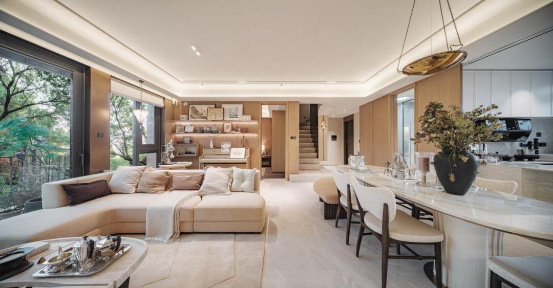 建面约145m²下叠,首层约9m南向三开间,让视野随天地庭院自然展开,搭配约6m宽奢横厅及约6m中庭挑空,于有形的方寸之间,开辟出上下层共享的奢居尺度。