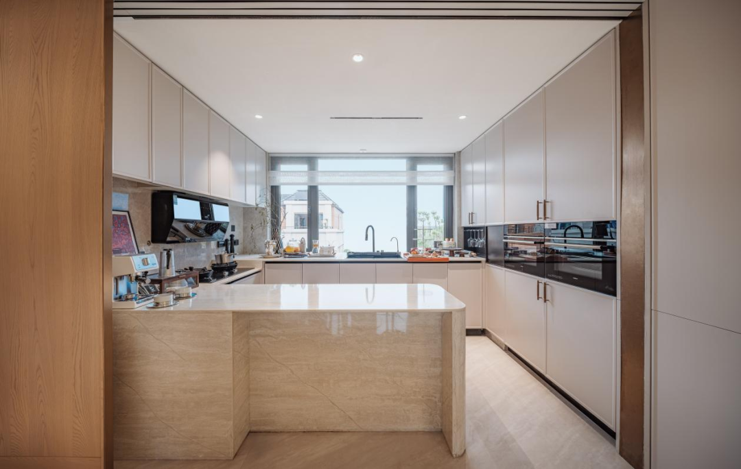 上叠的U型中西厨房,开间达到了约4.2m,还设置了长约2.2m的大岛台,可以当做备餐台、早餐桌、或者工作台,搭配LDK一体化空间,形成了一个超过35m²的巨幅生活空间。